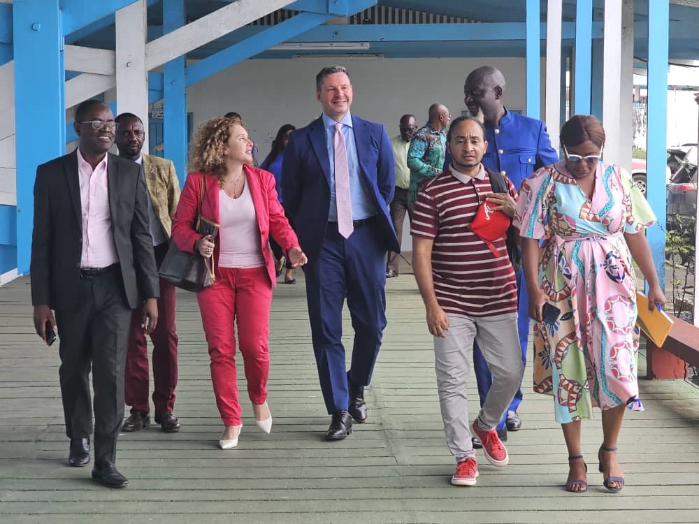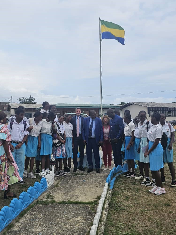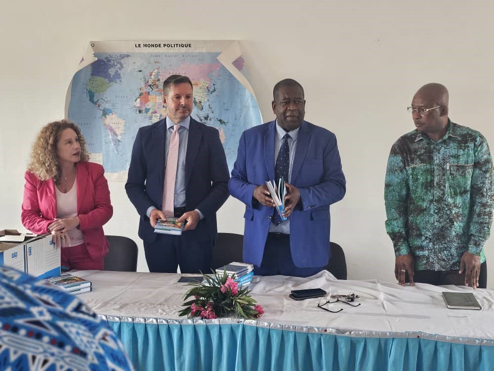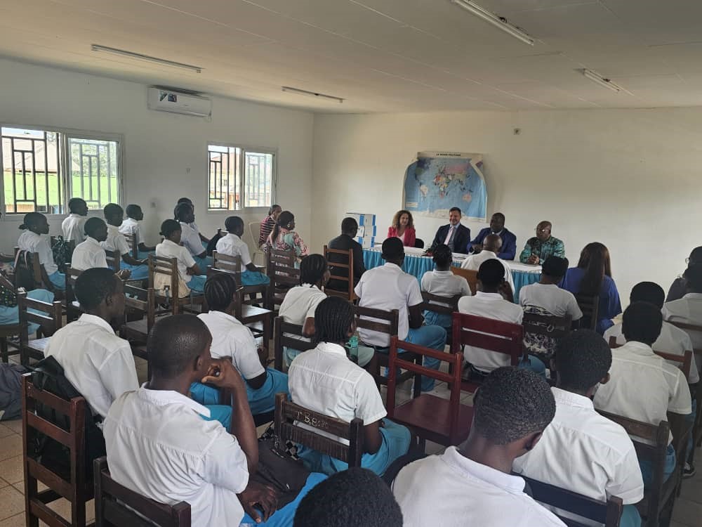 Nel corso della “Settimana della Lingua Italiana nel Mondo” L’Ambasciatore Stefano Moscatelli e la Dott.ssa Catia Rossi dell’Ambasciata hanno fatto visita al Liceo “Paul Indjendjet Gondjout” di Libreville – il più grande del Gabon, con oltre 5.000 allievi – per incontrare i giovani studenti di italiano. Il Preside del Liceo, Prof. Aloise Ethoughe Asame, e l’intero corpo docente hanno espresso interesse per il potenziamento dell’insegnamento della nostra lingua, chiedendo il sostegno delle Autorità italiane. Gli studenti hanno rivolto domande riguardanti, in particolare, le borse di studio offerte dal Governo italiano per poter proseguire gli studi in Italia. Nel corso dell’incontro sono state distribuite 50 copie dei testi inviati dal Ministero, in lingua italiana e francese, “Roma, seconda stella a destra” e “Mille meraviglie in blu”, che arricchiranno la biblioteca dell’Istituto.